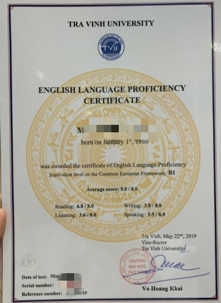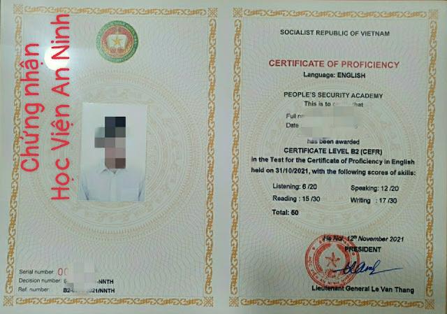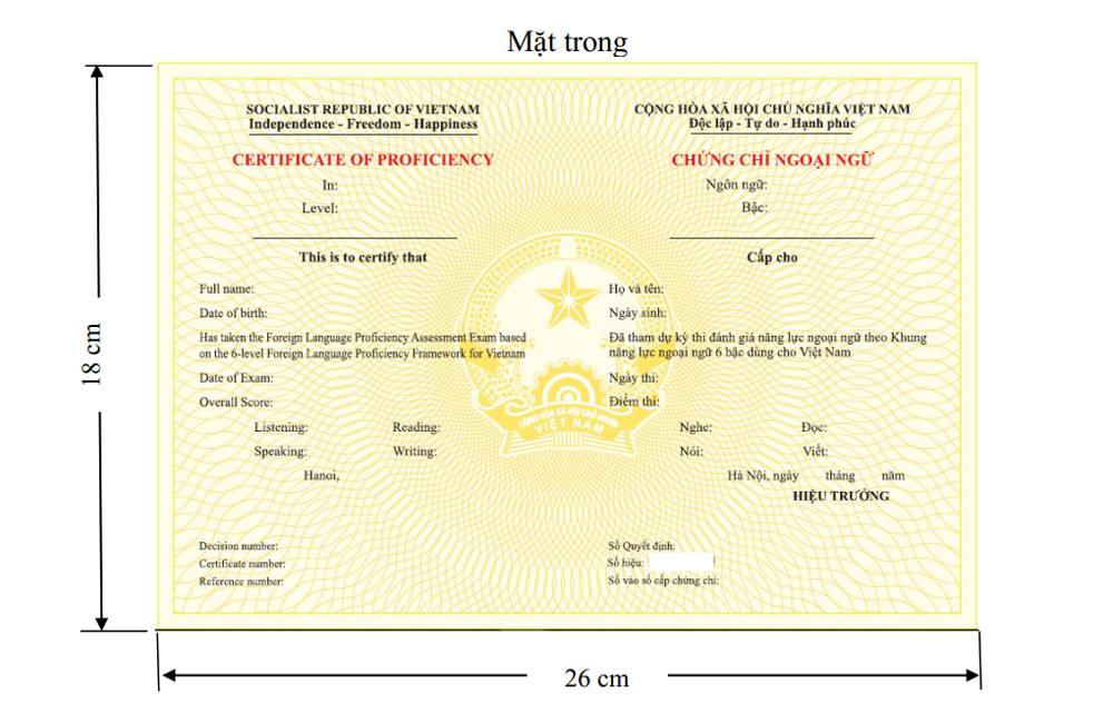 - Mặt trước in song ngữ Anh - Việt: có chứa thông tin thí sinh, kỳ thi gì, ngày nào, điểm thi từng phần, đơn vị nào cấp, ký tên đóng dấu... theo đúng mẫu.
