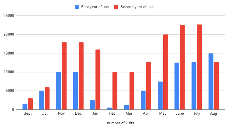 Task 1: The barcharts below shows the number of visits to a community website in the first and second year of use.