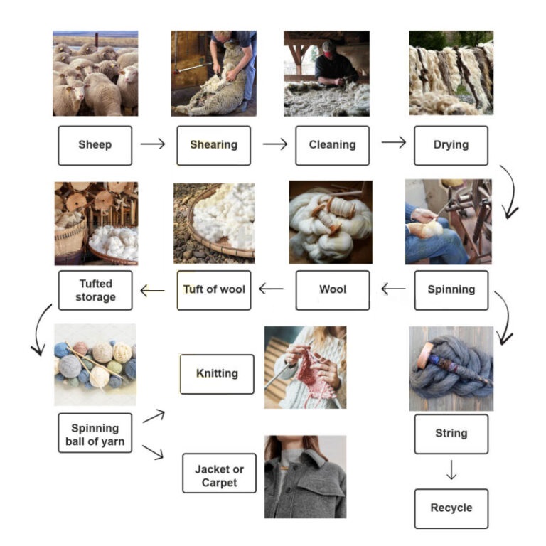 Task 1: The diagram shows the different stages in the production of woolen goods. Summarize the information by selecting and reporting the main features and make comparisons where relevant.