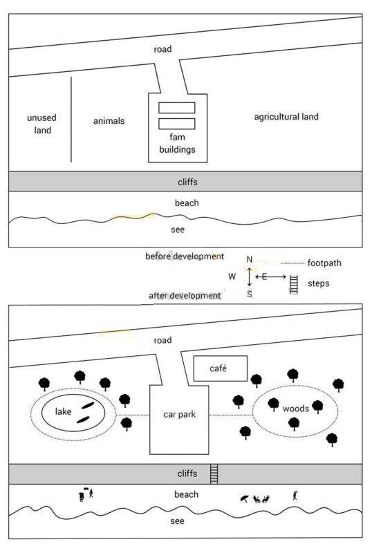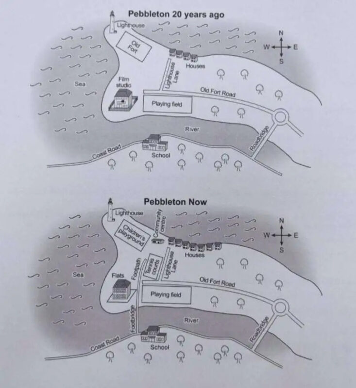 Task 1: The maps show the village of Pebbleton 20 years ago and now. Summarise the information by selecting and reporting the main features, and make comparisons where relevant.