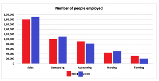 Task 1: The bar graph shows the number of people employed in different workplaces in one region of Australia in 2001 and 2008. Summarise the information by selecting and reporting the main features and make comparison where relevant.