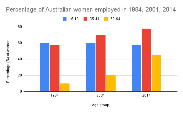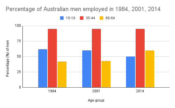 Task 1: The charts below show the percentage of Australian men and women in three age groups who were employed in 1984, 2001 and 2014.