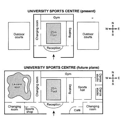 Task 1: The plans below show the layout of a university’s sports center now, and how it will appear after redevelopment. Summarise the information by selecting and reporting the main features, and make
