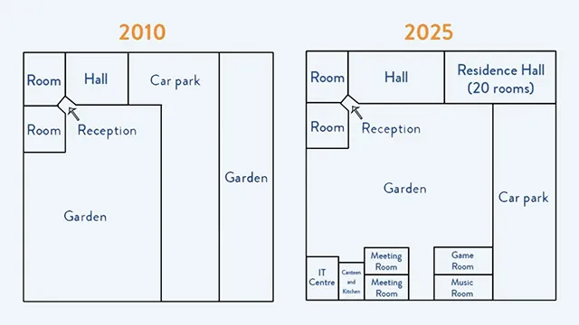 Task 1: The picture below shows the difference in the layout of the conference centre in 2010 and 2025.