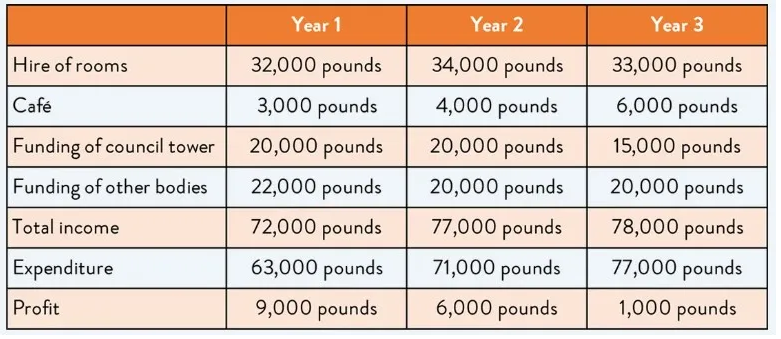 Task 1: The table shows the income and expenditure of Brooklyn Hall, the building used to hire in over the period of three years. Summarize the information by selecting and reporting the main features and make comparisons where relevant.