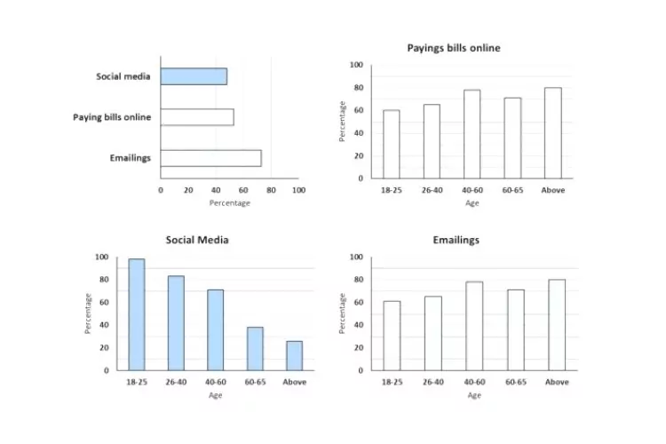 Task 1: The chart shows Australian home Internet use by reasons and age groups. Summarise the information by selecting and reporting the main features, and make comparisons where relevant.