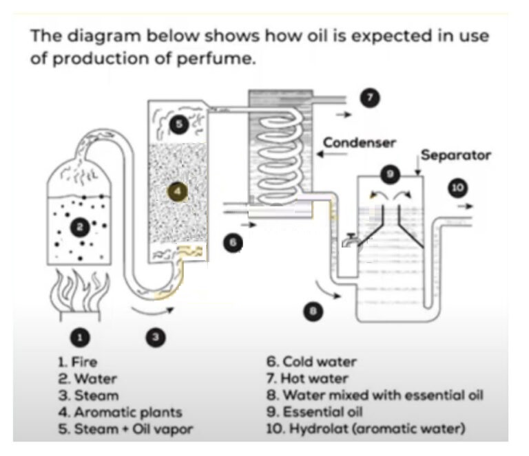 Task 1: The diagram below shows how oil is expected in use of production of perfume. Summarise the information by selecting and reporting the main features, and make comparisons where relevant.