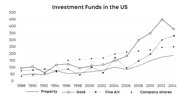 Task 1: The graph shows the value in US dollars (in millions of dollars) of investment in funds of four categories from 1988 to 2014.