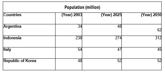 Task 1: The table below shows population figures for four countries for 2003 and projected figure for 2025 and 2050.