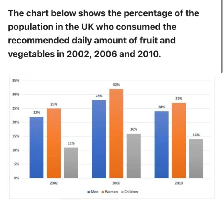 Task 1: Percentage of UK people who consumed daily recommended amounts of fruit and vegetables in 2002, 2006 and 2010. Summarize the information by selecting and reporting the main features and make comparisons where relevant.