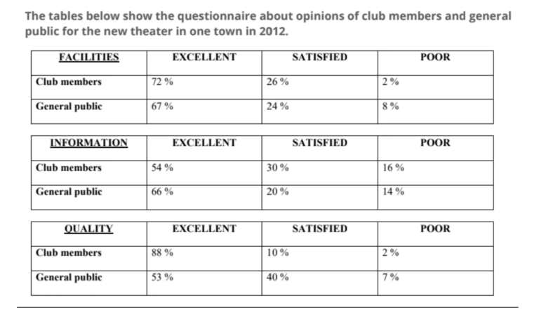 Task 1: The table below shows the questionnaire about the opinions of club members and general public for the new theater in one town in 2012. Summarize the information by selecting and reporting the main features, and make comparisons where relevant.