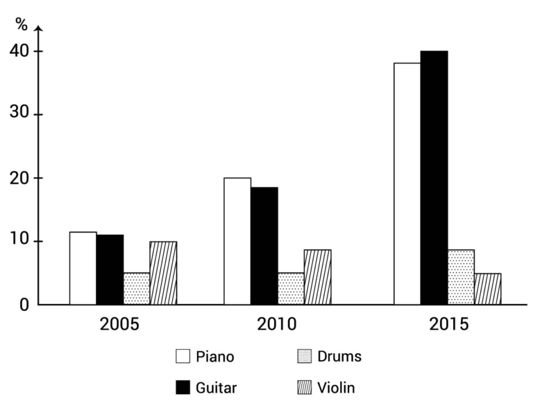 Task 1: The bar chart showed the percentage of school children learning to play four different musical instruments (violin, guitar, piano, drums) in 2005, 2010, 2015.