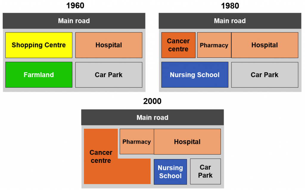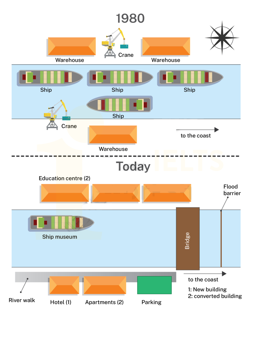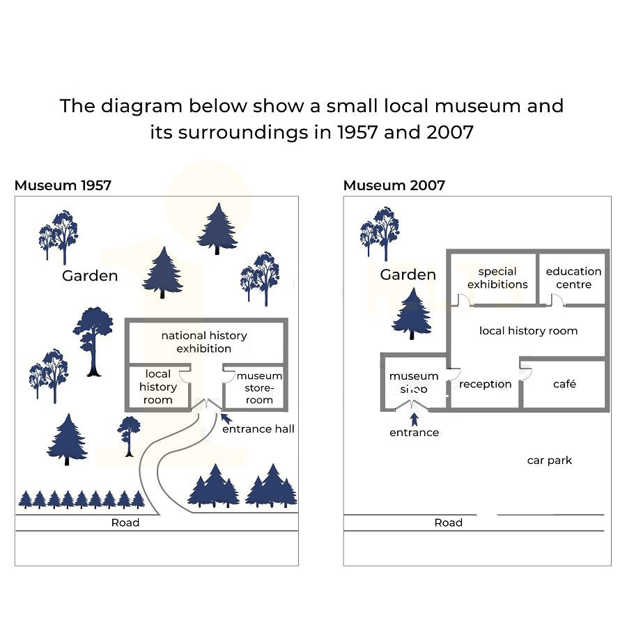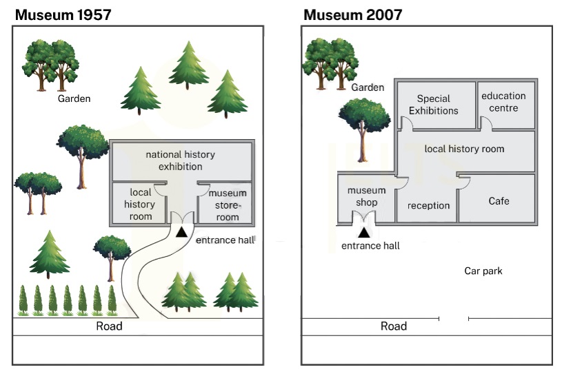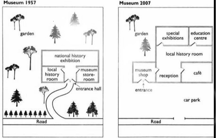 Task 1: The diagrams below show a small local museum and its surroundings in 1957 and 2007.