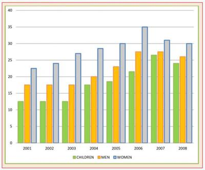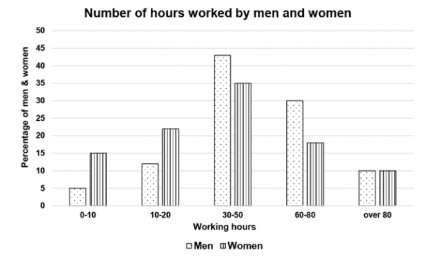 Task 1: The bar chart shows the number of hours worked by men & women per week in Australia in 2007.