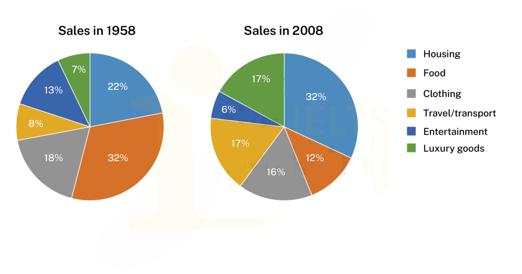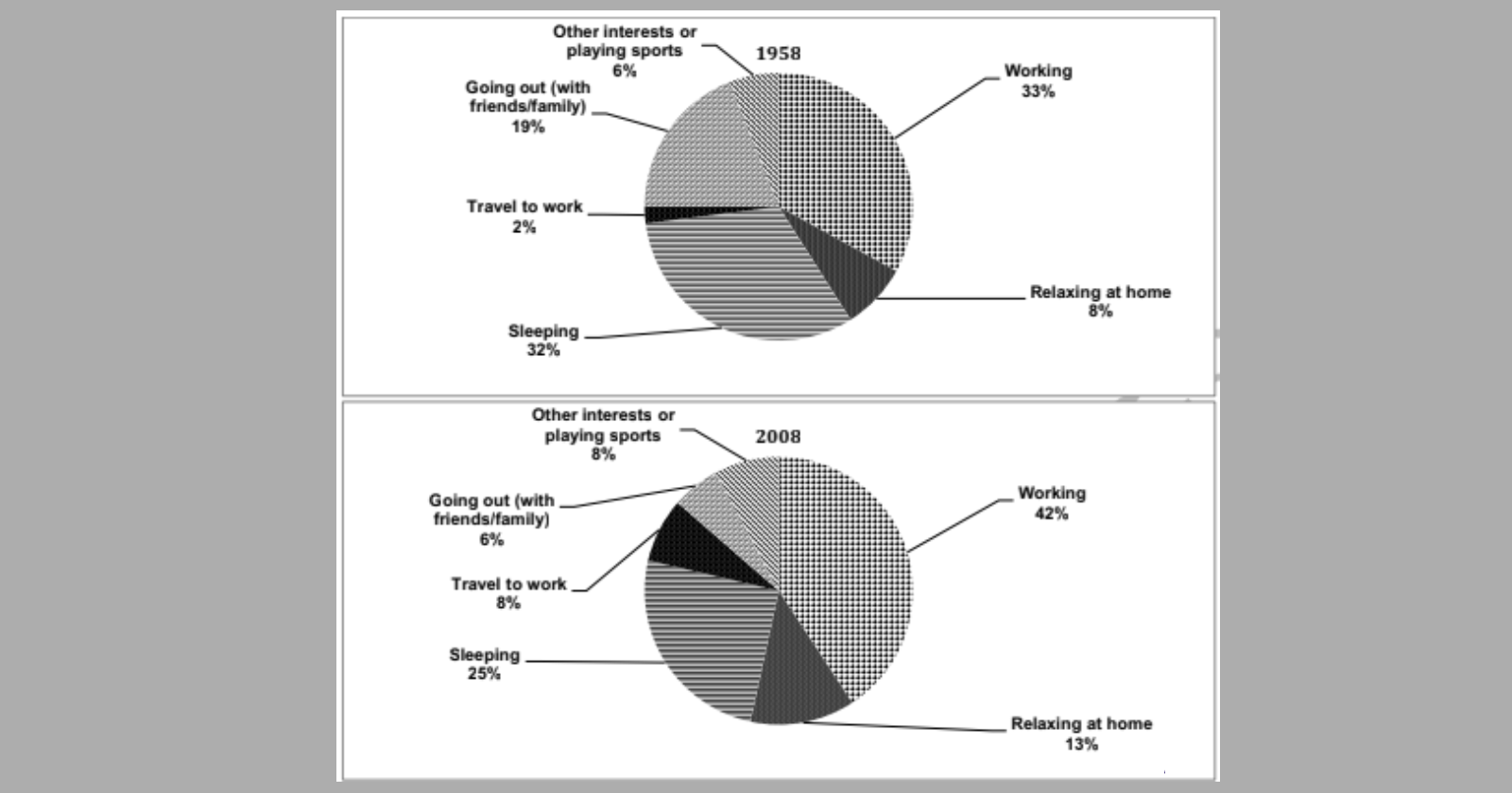 Task 1: The pie charts below show the percentage of time working adults spent on different activities in a particular country in 1958 and 2008. Summarise the information by selecting and reporting the main features and make comparisons where relevant.
