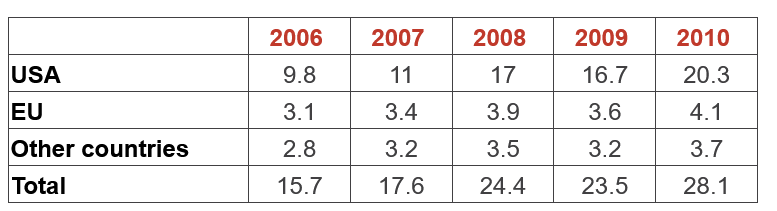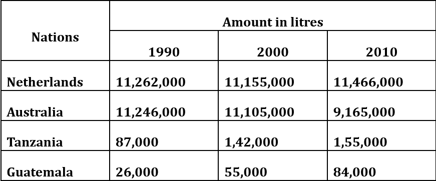 Task 1: The table shows the production of milk annually in four countries in 1990, 2000 and 2010.