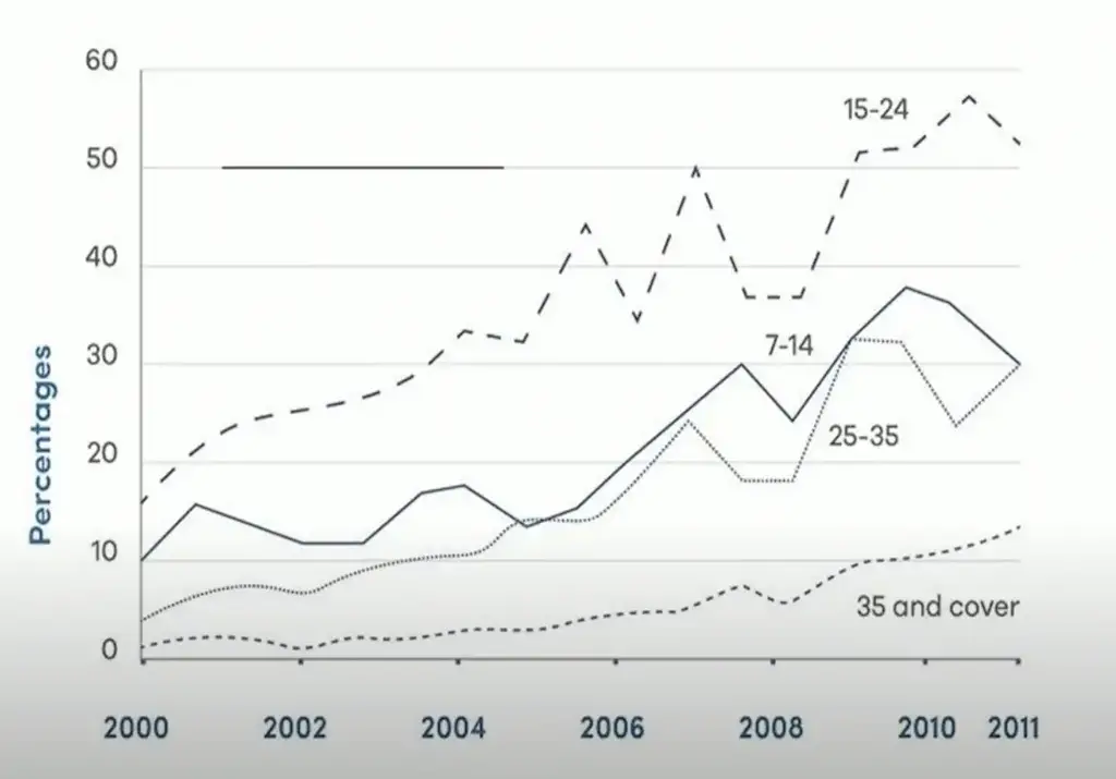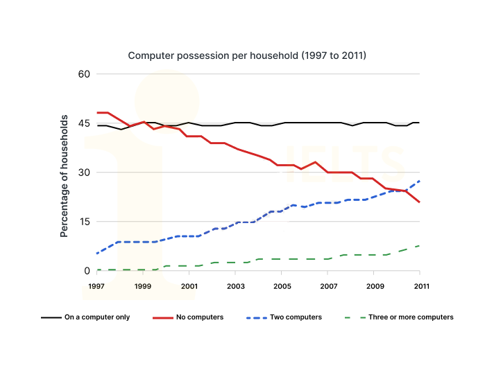 Task 1: The graph below gives information about computer possession by household in one European country between 1997 and 2011. Summarise the information by selecting and reporting the main features, and make comparisons where relevant. Write at least 150 words.