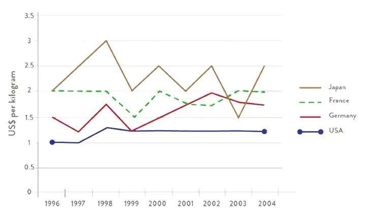 Task 1: Line chart – The graph below shows the number of applicants from four different countries in a UK university between 1999 and 2003.