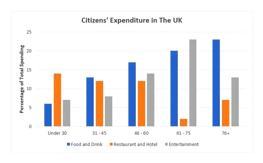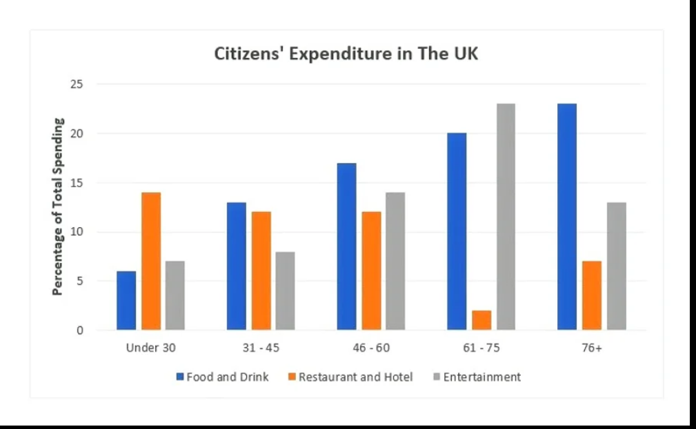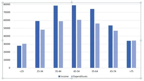 Task 1: The chart below gives information about the ratio of income to spending (in dollars) by Americans by age range in 2013.