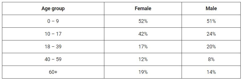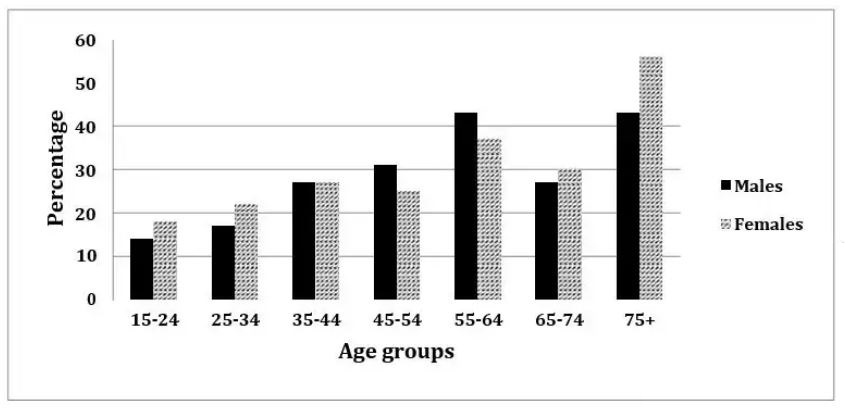 Task 1: The bar chart shows the percentage of males and females in the UK by age group in 2006.
