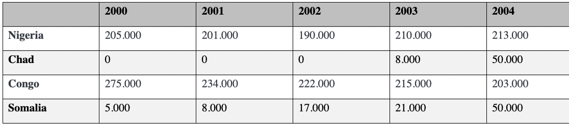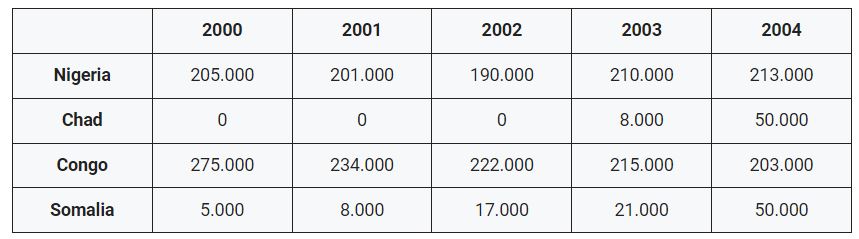 Task 1: The table below shows daily oil production in 4 countries from 2000 to 2004.