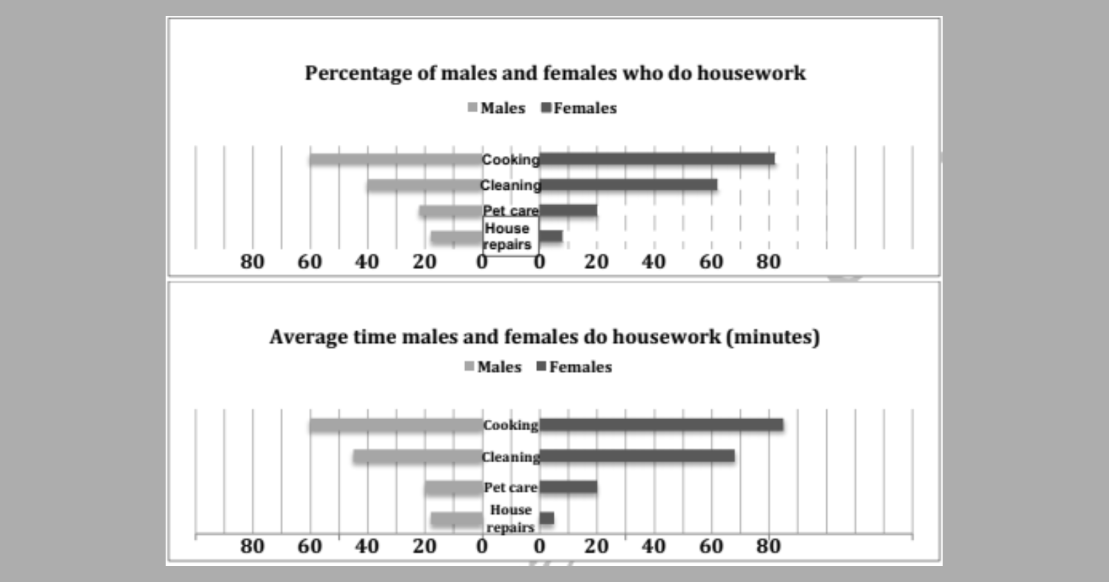 Task 1: The first chart below shows the percentages of women and men in a country involved in some kinds of home tasks (cooking, cleaning, pet caring and repairing the house). The second chart shows the amount of time each gender spent on each task per day.