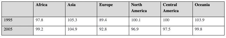 Task 1: The table shows the population ratio of females per 100 males in six different areas (Africa, Asia, Europe, North America, Central America, Oceania) in 1995 and 2005.