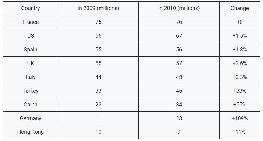 Task 1: The table below gives information about the international tourists arrival in millions in 9 countries from 2009 to 2010 and the changes (in percentage).