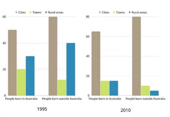 Task 1: The bar chart below describes some changes about the percentage of people were born in Australia and who were born outside Australia living in urban, rural and town between 1995 and 2010.