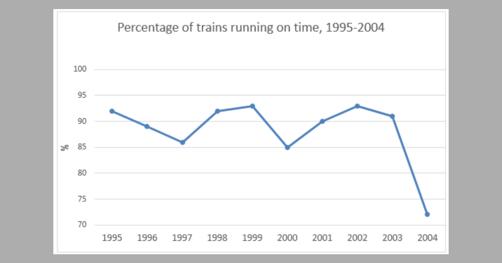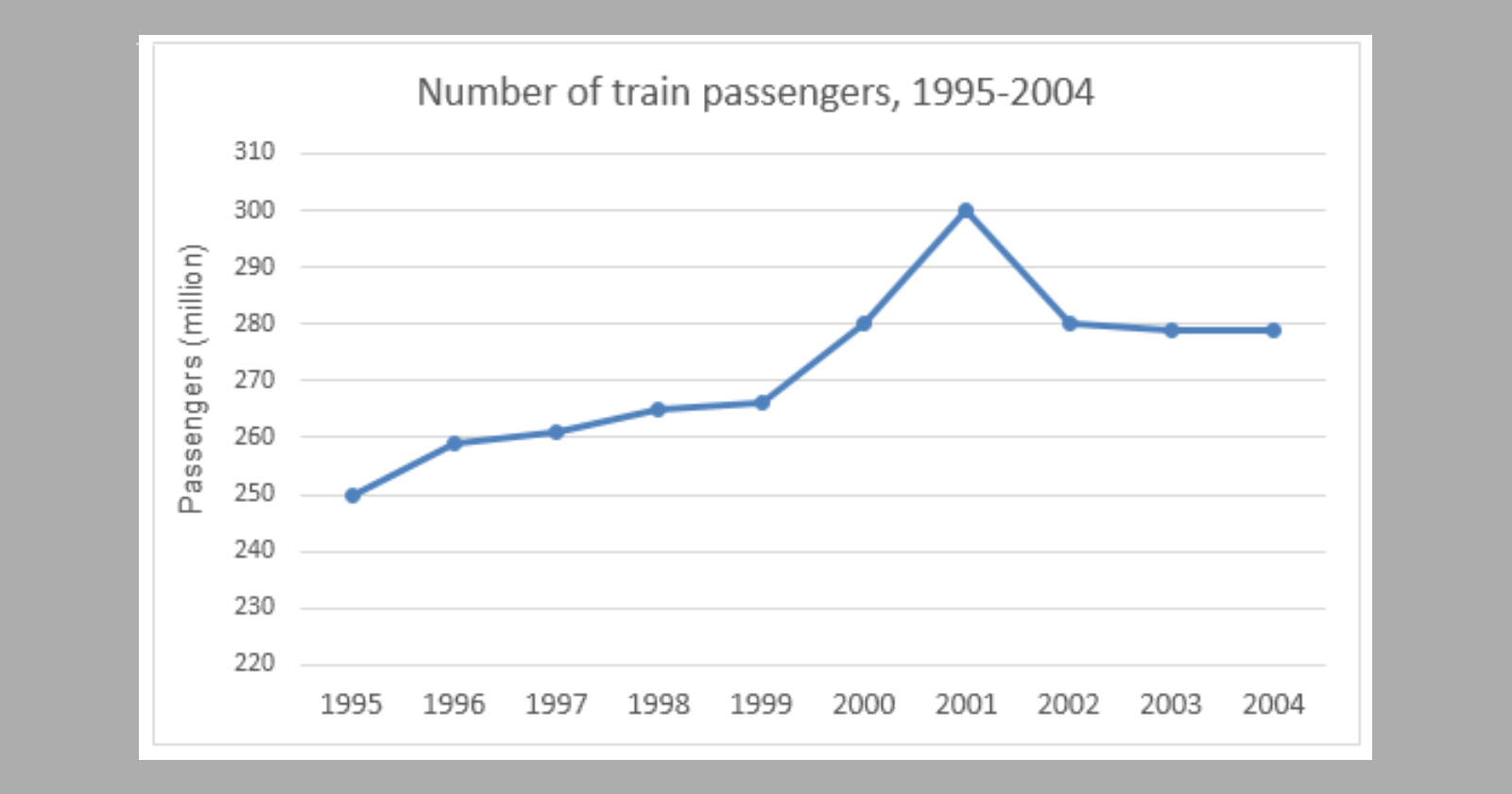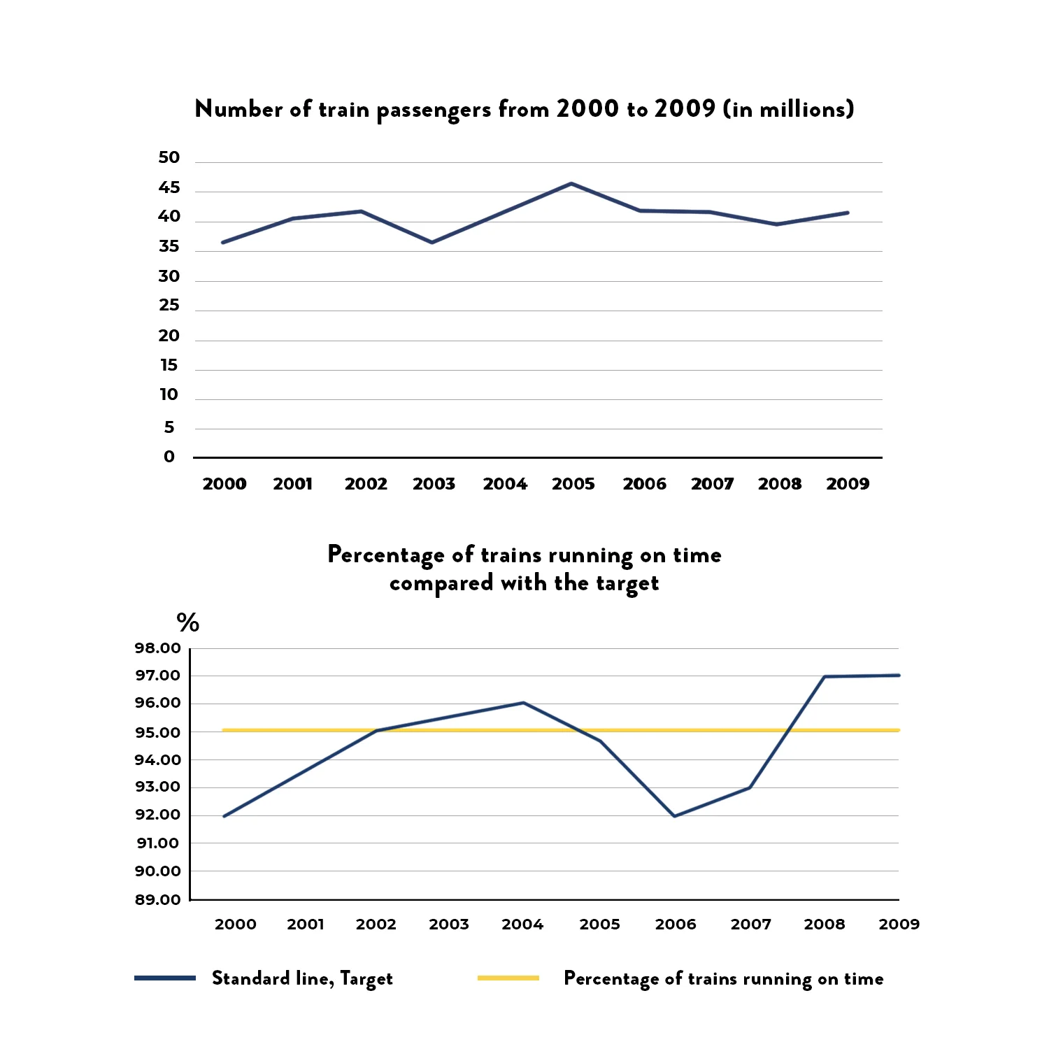 Task 1: The first graph shows the number of train passengers from 2000 to 2009; the second compares the percentage of trains running on the time and target in the period.