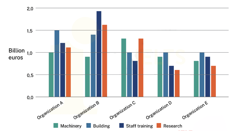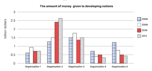 Task 1: The chart below shows the amount of money given to developing countries by five organisations from 2008 to 2011.