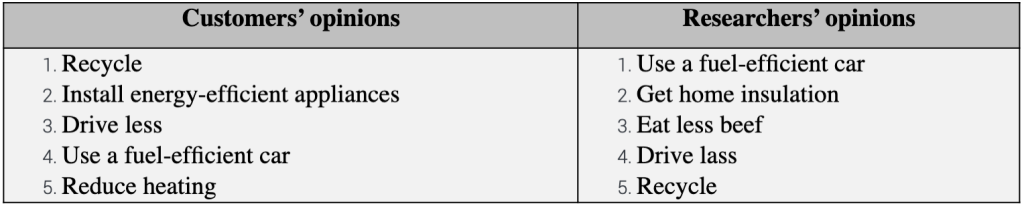 Task 1: The table gives information about top five suggestions to reduce global warming made by customers and researchers.