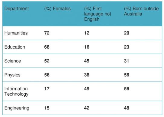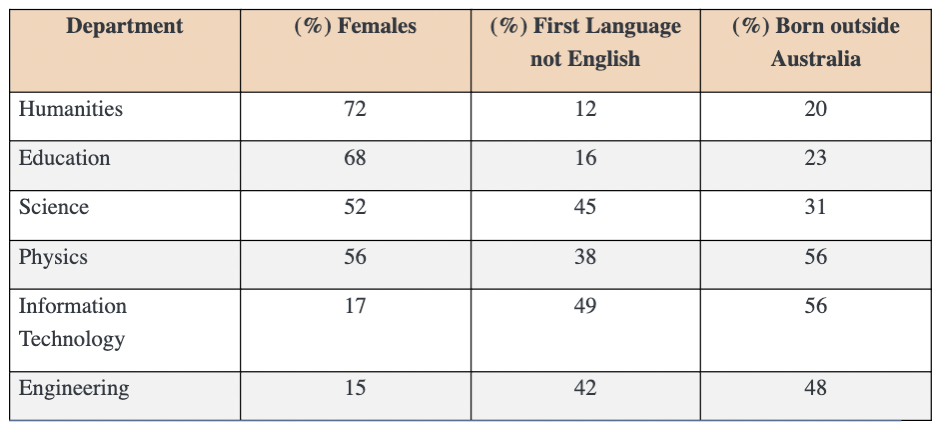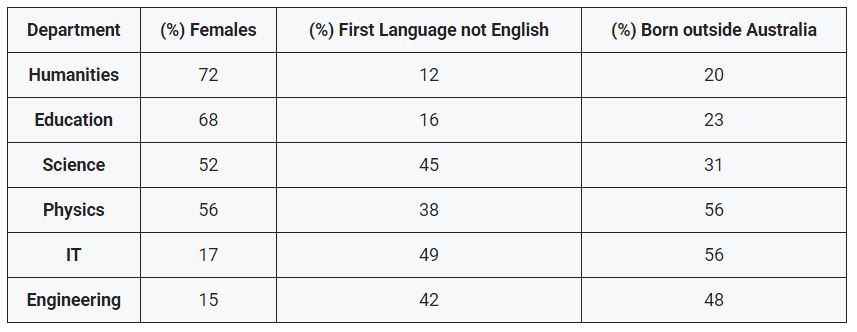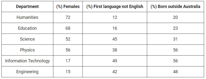 Task 1: The table below gives information about students studying in six departments in an Australian university in 2011.