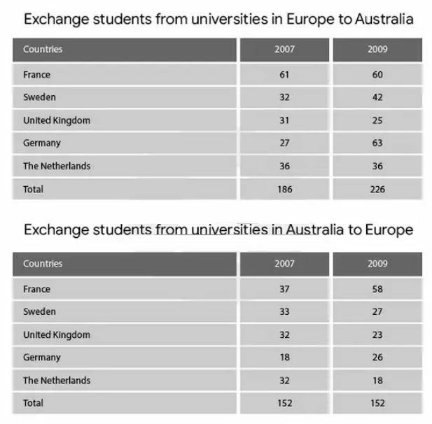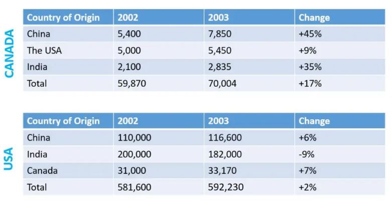 Task 1: The tables show how many international students study in Canada and the United States by country of origin.