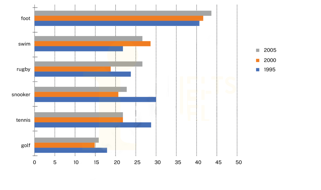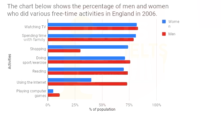 Task 1: The chart below shows the percentage of of men and women who did various free-time activities in England in 2006.