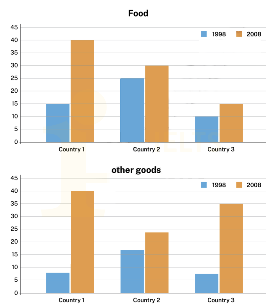 Task 1: The charts show the percentage of income spent on food and other goods in 3 countries from 1998 – 2008.