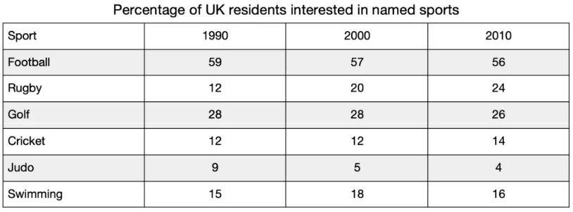 Task 1: The table below shows the results of surveys of people in the UK, carried out in three different decades. It shows the percentages of people who said they were interested in certain sports.