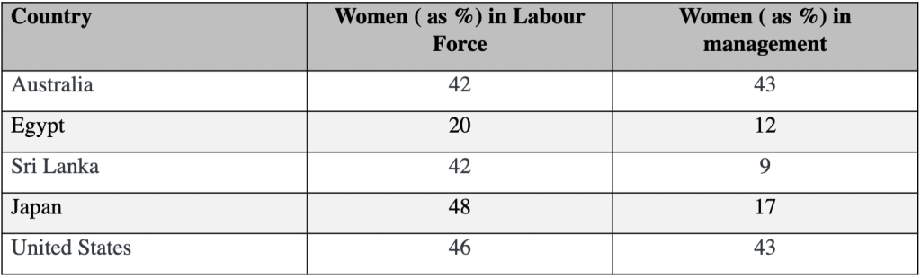 Task 1: The table below shows the proportion of the workforce who are women and the proportion of managers who are women in five different countries.