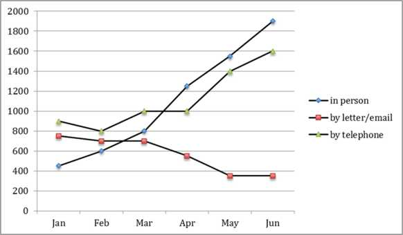 Task 1: The graph below shows the number of enquiries received by the Tourist Information Office in one city over a six-month period in 2011.