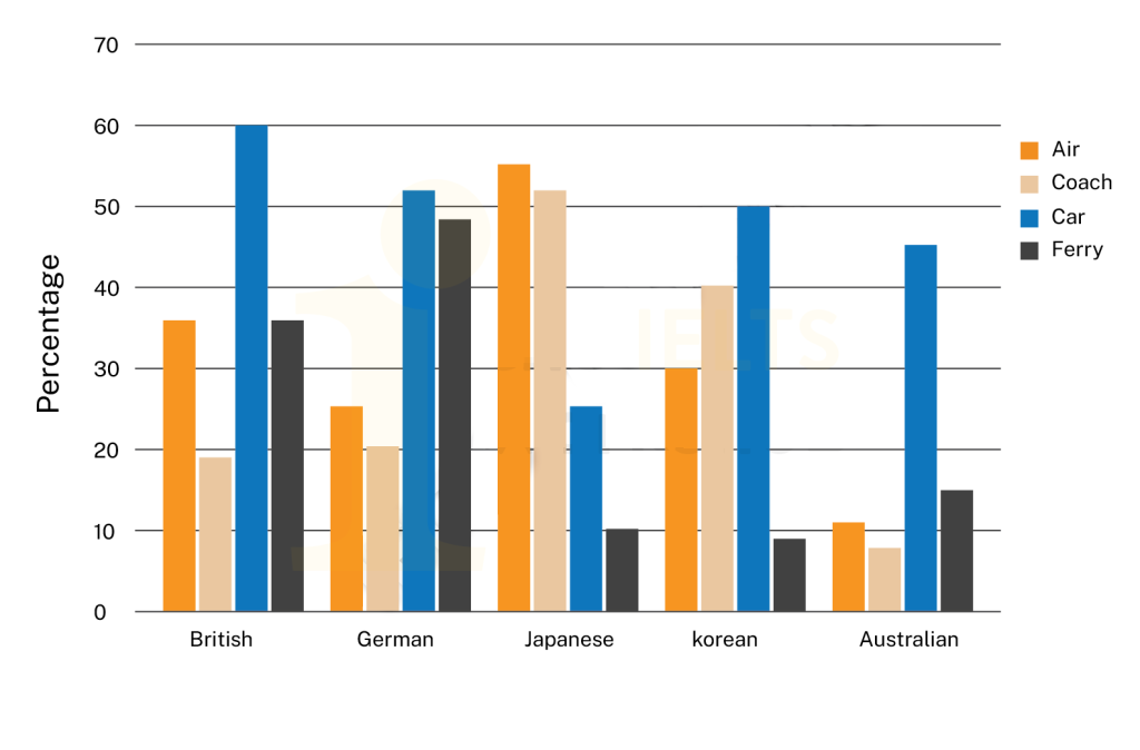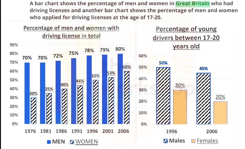 Task 1: A bar chart shows the percentage of men and women in Great Britain who had driving licenses and another bar chart shows the percentage of men and women who applied for driving licenses at the age of 17-20.