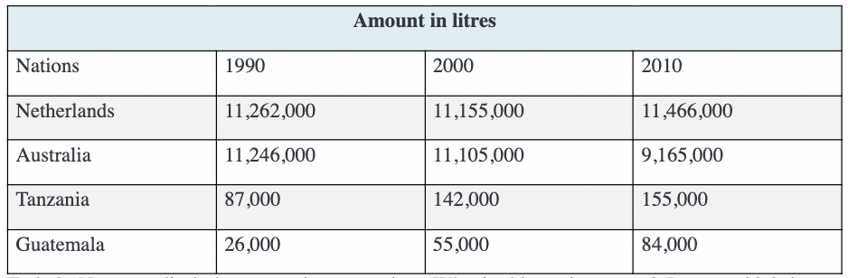 Task 1: The table below shows the production of milk annually in four countries in 1990, 2000 and 2010.