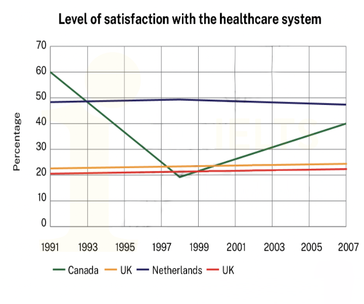 Task 1: The graph below shows people’s level of satisfaction with the health care system in 4 countries between 1991 and 2007. Summarise the information by selecting and reporting the main features, and make comparisons where relevant.