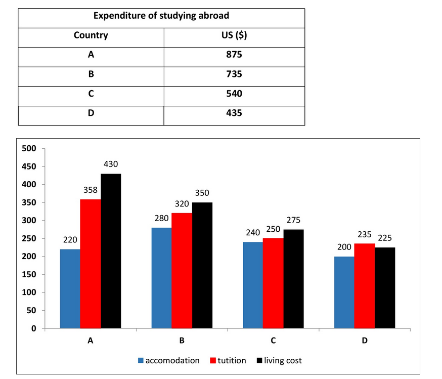Task 1: The table and chart below provide a breakdown of the total expenditure and the average amount of money spent by students per week while studying abroad in 4 countries.