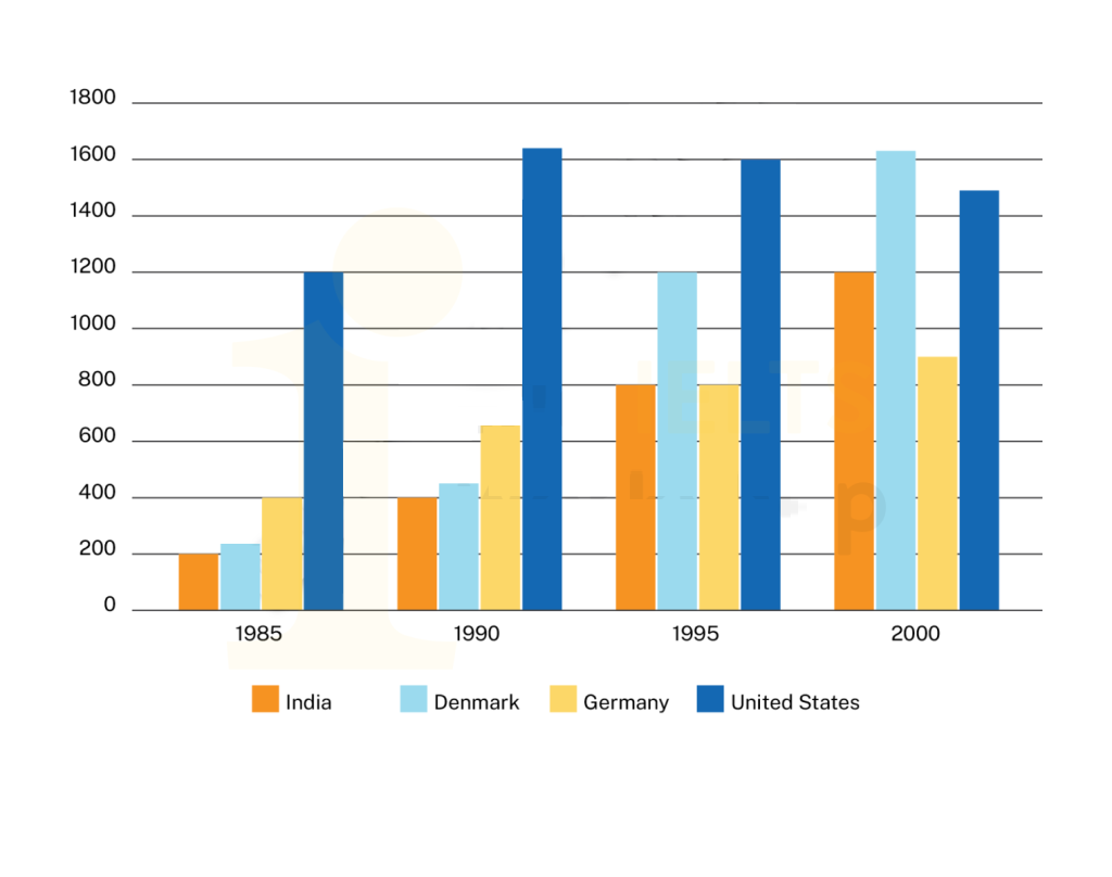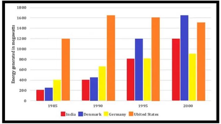 Task 1: The chart shows the amount of energy generated from wind in four countries from 1985 to 2000.