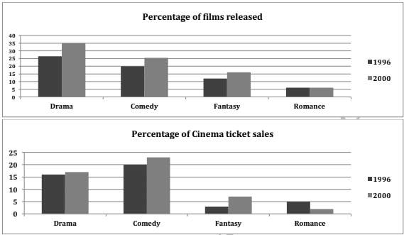 Task 1: The graphs below show the total percentage of films released and the total percentage of ticket sales in 1996 and 2006 in a country. Summarise the information by selecting and reporting the main features and make comparisons where relevant.
