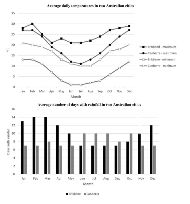 Task 1: The graph and chart below give information on the average daily maximum and minimum temperatures in degrees Celsius (°C) and the average number of days with rainfall each month for two Australian cities.