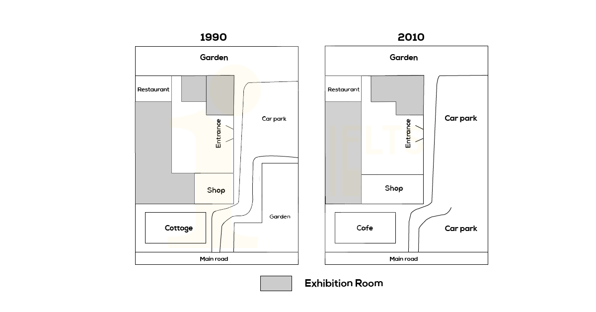 Task 1: The maps show the changes made to a small museum and its surroundings in 1990 and 2010.