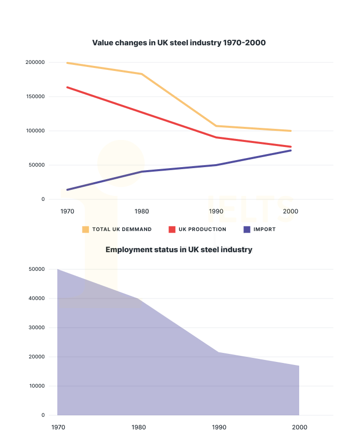 Task 1: The graphs show the changes in the UK industry steel between 1970 and 2000. (million tonnes vs thousand)