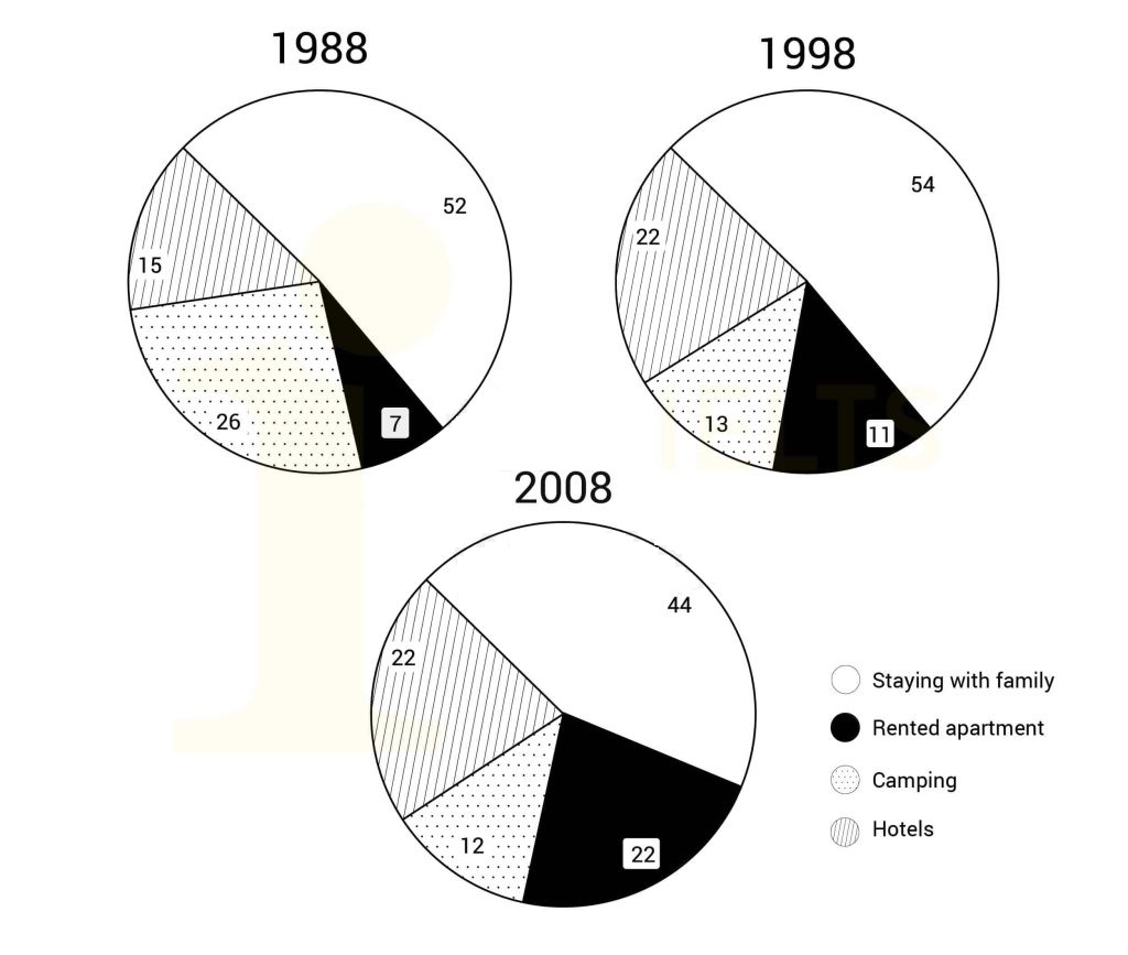 Task 1: The charts below the proportion of holiday makers using three different types of accommodations in three different years.